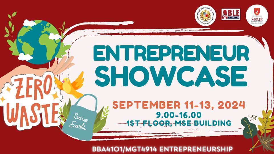 All News, Student News Entrepreneur Showcase Views: 2 Entrepreneur Showcase Date: September 11-13, 2024Time: 9.00-16.00 Hrs. What to Read Next: All News Awards and Achievements Student News AU takes on Asia… and beyond 27/03/2026 All News Awards and Achievements AU FRM Team Wins First Runner-Up at ICMSS Competition 2026 13/02/2026 All News Seminar & Workshops & Events Food Event Experiences: Inspiring Ideas and Conceptual Planning 11/02/2026 All News Awards and Achievements Student News MSME Winning National Economics Research Competition 2025 06/02/2026 All News Awards and Achievements Student News Achievement in National Economics Research Competition 06/02/2026 All News Awards and Achievements Student News DDI Students Win 3rd Place at AI Estha Hackathon 02/02/2026 All News MOU & Partnerships & Social Services Shaping Global Futures: SMU – AU MoU Signing Ceremony 01/02/2026 All News Awards and Achievements 51st Thailand University Games: Inthanin game 2026 28/01/2026