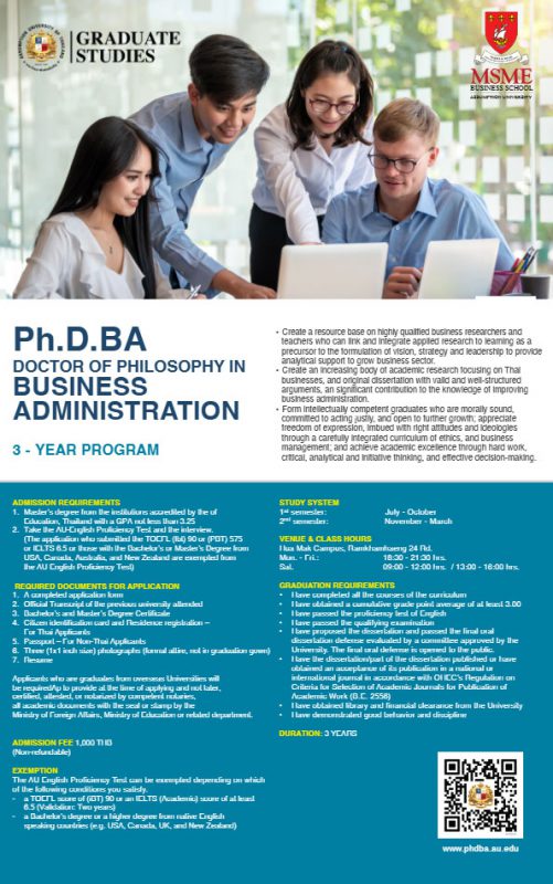 Assumption University aims to offer a Ph.D. program in Business Administration as an educational building block for prospective scholars in search of pursuance of a rigorous, innovative, and discipline-based research in business. The mission of the School is to achieve leadership through thought and action in the world of management. Our Ph.D. Program is central to that mission, providing rigorous training toward an academic career, thus producing future leaders in business research and management.