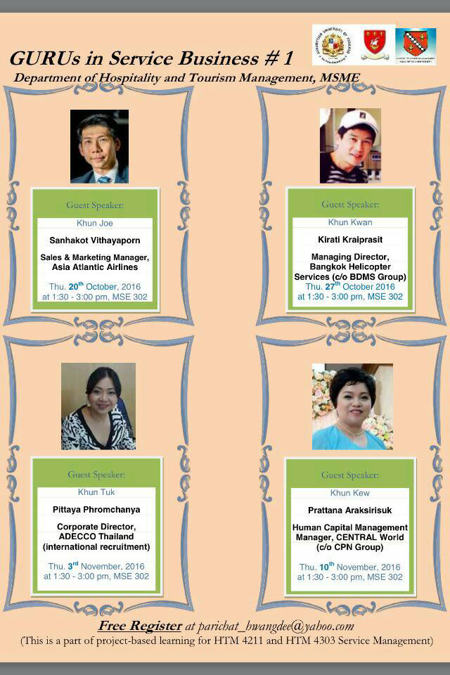 GURUs in Service Business #1 October 10, 2016 Pisal Setthawong Competition, Department, HTM, News, Seminar & Workshops, Student Department of Hospitality and Tourism Management, MSME Share This Twitter Facebook LinkedIn Email