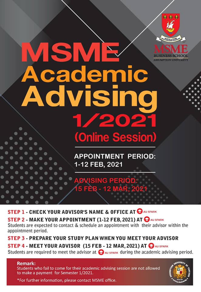 Online MSME Academic Advising for 1/2021 February 1, 2021 Pisal Setthawong Current Student News Online MSME Academic Advising for 1/2021 Share This Twitter Facebook LinkedIn Email