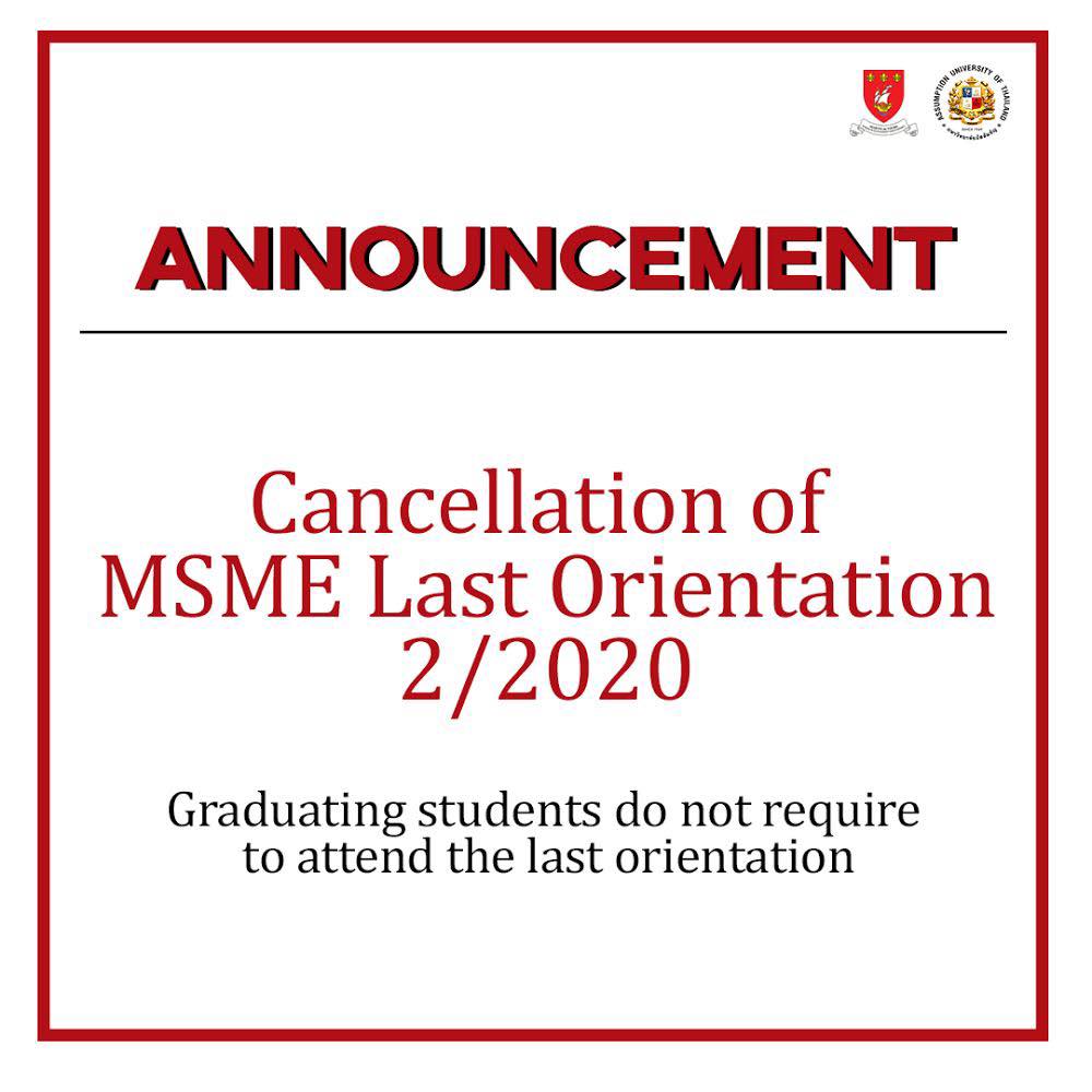 Cancellation of MSME Last Orientation 2/2020 February 4, 2021 Pisal Setthawong Current Student News, Faculty, Faculty News Cancellation of MSME Last Orientation 2/2020 Graduating students do not require to attend the last orientation Share This Twitter Facebook LinkedIn Email